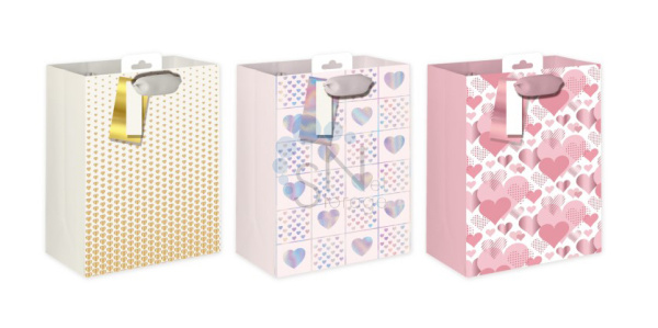 Пакет подарочный 26*32*12 Сердечки KARIIOU матовая ламинация тиснение фольгой подвес-открытка 210г/м2 КОКОС 253889 ассорти 3 вида
